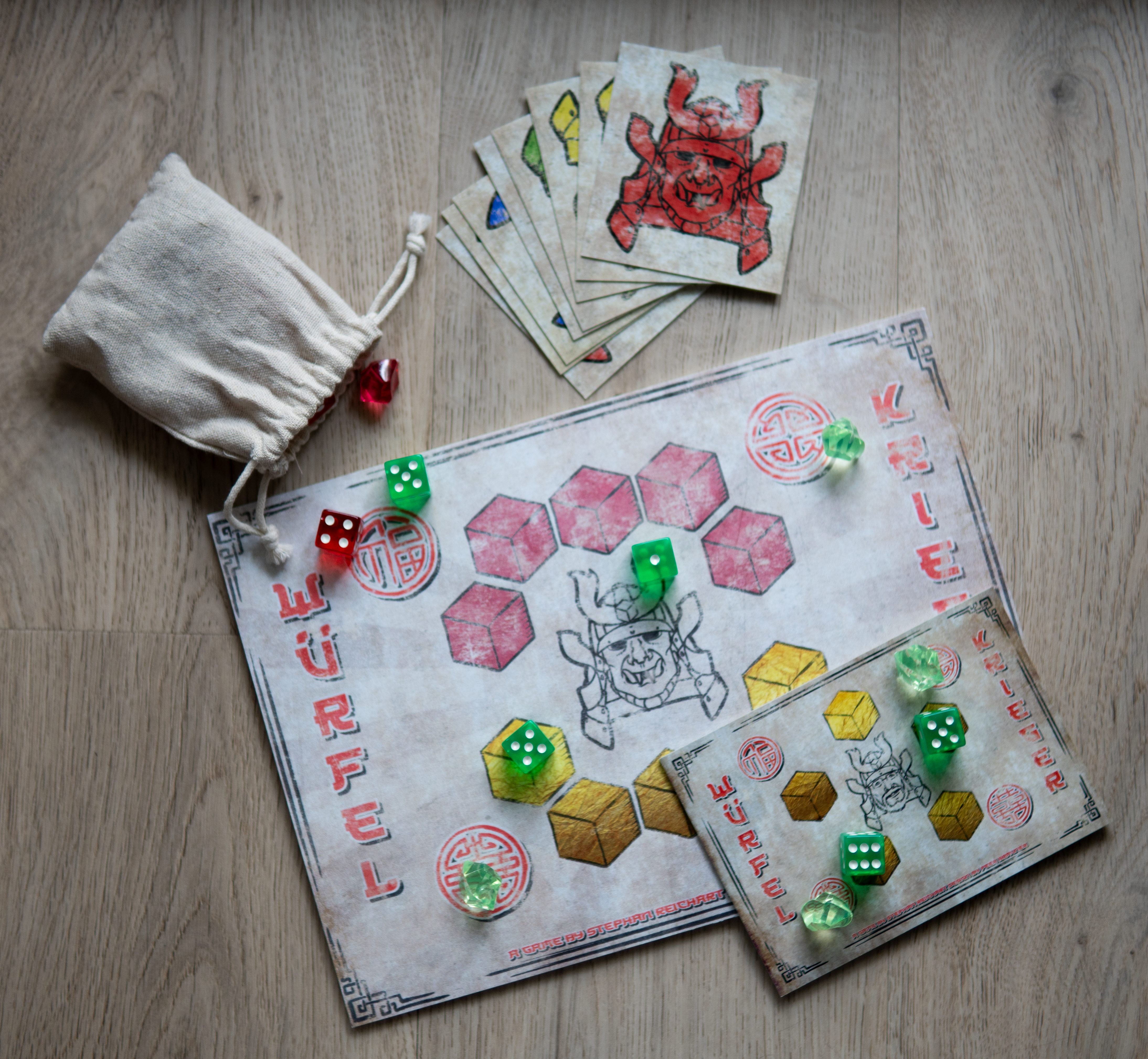 Reise in die Welt der Samurai, ins alte Japan und erlerne die Kunst des Würfelns. In DerReichart's Würfel Krieger kämpfst du nicht mit Waffen, sondern mit Würfeln gegen deine Gegner, um ihnen all ihre Edelsteine abzunehmen. Setze deine Würfel weise, übertreffe allein oder im Team deine Gegenspieler:innen und beweise Köpfchen und situatives Geschick um am Ende die höchste Punktzahl zu erreichen.